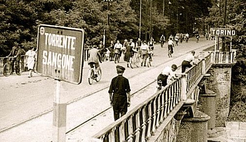 In questa foto del dopoguerra si può vedere il vecchio ponte sul Sangone, tra Mirafiori e Nichelino.