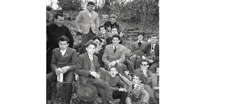 Nella foto uno dei partecipanti apre un pacchetto di Pavesini, un altro suona l’armonica a bocca; chi si è portato il binocolo e chi tiene a tracolla la caratteristica borsa di tela blu con bordi di plastica bianca per il pranzo al sacco. Come da prassi qualcuno non resiste alla tentazione di fare il gesto delle corna di fronte alla macchina fotografica. Era il 1962, sessant’anni fa: l’immagine di una gioventù spensierata, sotto lo sguardo felice e sorridente del viceparroco don Antonio Pettiti. La comitiva era nei boschi vicino al santuario di Oropa. (Foto Dino)