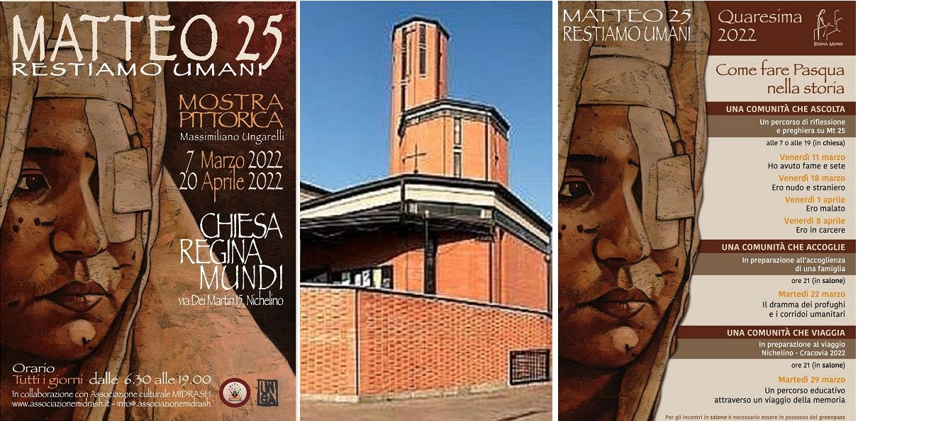 Fino al 20 aprile la parrocchia della Maria Regina Mundi a Nichelino ospita la mostra Matteo 25 – Restiamo Umani dell’autore Massimiliano Ungarelli.
