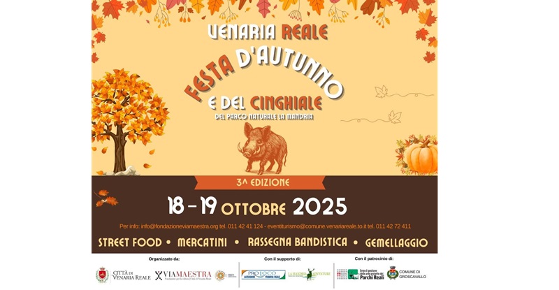 (dove c’è il parco La Mandria) per il week end del 18 – 19 ottobre allestisce la terza edizione della Sagra del Cinghiale con “un’esplosione di gusto” e con tanto di patrocinio dell’Ente Parchi Reali, lo stesso che gestisce Stupinigi.