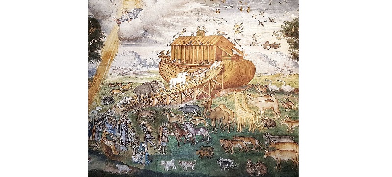 Nell’arca contiamo otto persone: Noè con la moglie, i suoi tre figli con le rispettive compagne (otto numero simbolico, 7 la perfezione + 1 Dio) e una coppia di ogni animale presente sulla terra per assicurare la riproduzione dopo il diluvio. L’arca che galleggia perché ricoperta di bitume (tipica costruzione mediorientale, lì sono ricchi petrolio…) è una specie di palazzo galleggiante di tre piani così costruito: 160 metri di lunghezza, 28 mt di larghezza, 18 mt di altezza, ha una porta laterale e un tetto munito di finestra.