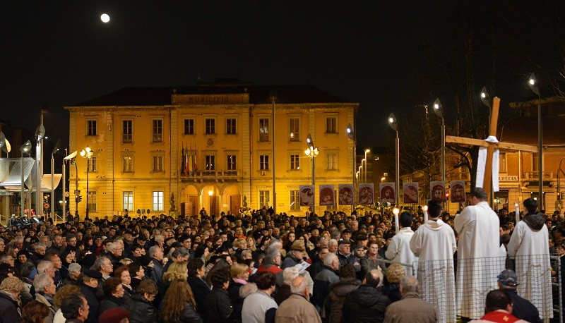 Il ritrovo è alle ore 20,45 in piazza Camandona alla Crociera. Le 14 Stazioni della Via Crucis saranno posizionate lungo la via Torino, conclusione in piazza Di Vittorio. In caso di maltempo la Via Crucis si svolgerà all'interno della chiesa grande della Santissima Trinità.