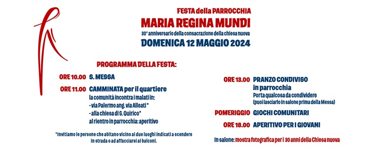 Domenica 12 maggio la parrocchia Maria Regina Mundi di Nichelino celebra la festa patronale e ricorda i 30 anni dalla consacrazione della chiesa nuova.