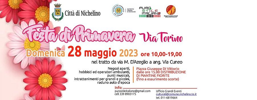 A Nichelino domenica 28 maggio dalle ore 10 alle 19 in via Torino Festa di Primavera con negozi aperti, musica, spettacol ed esposizione di auto d’epoca.