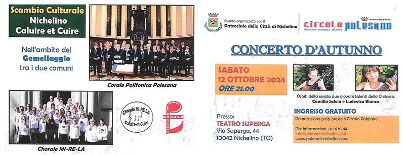 Sabato 12 ottobre ore 21 il concerto della Chorale Mi-Re-La di Caluire et Cuire e del Coro Polesano di Nichelino. Ospiti della serata le chitarriste Camilla Salvia e Ludovica Bianca.