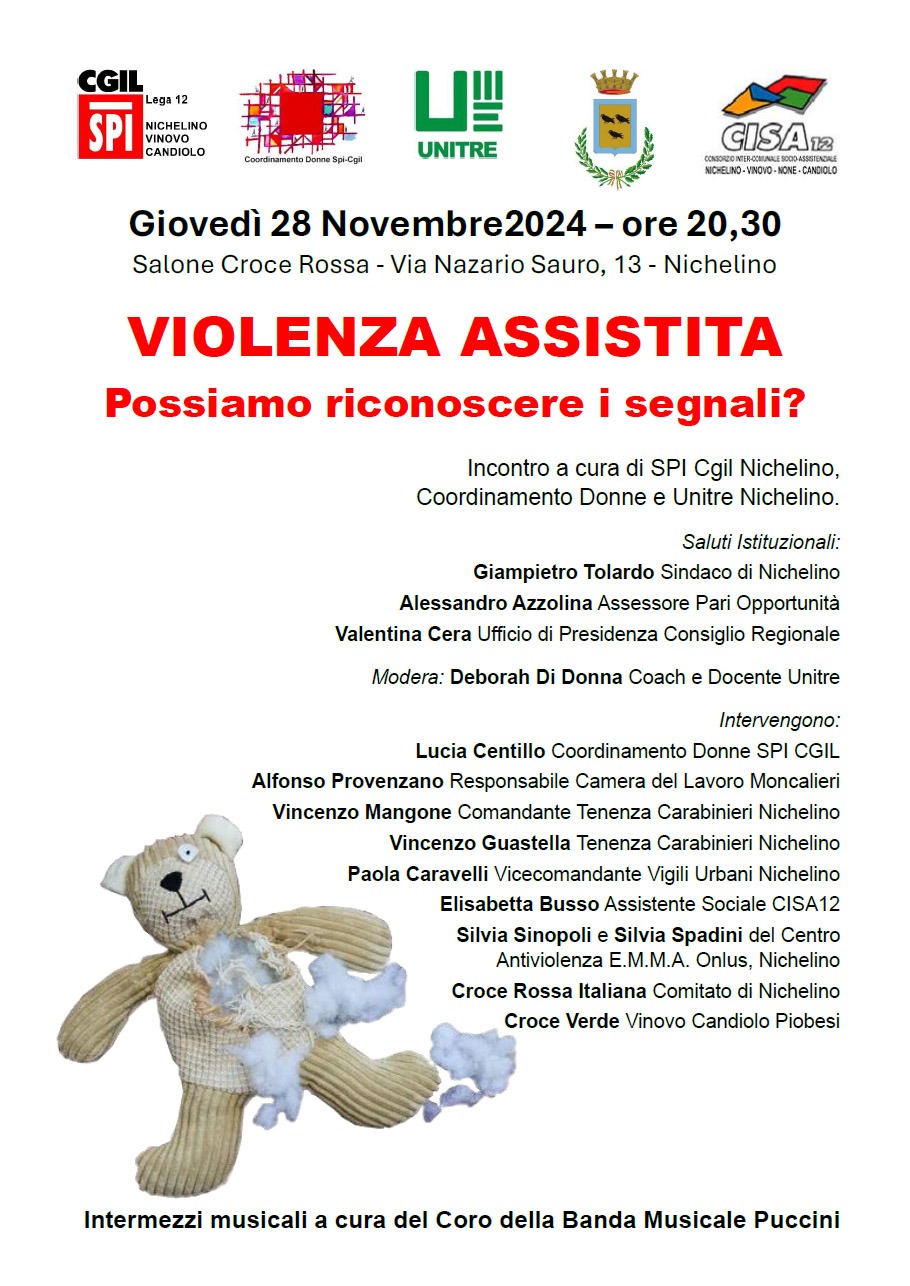 Giovedì 28 Novembre a Nichelino nel Salone Croce Rossa – Via N. Sauro, 13 alle ore 20,30 si terrà un incontro promosso da Spi Cgil Nichelino Coordinamento Donne e Unitre Nichelino nell'ambito della Giornata internazionale per l’eliminazione della violenza contro le donne.